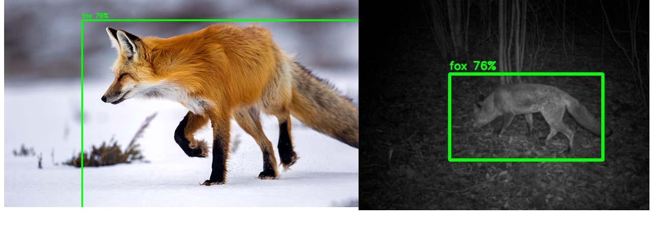 Detected objects are highlighted in the image using a bounding box displaying the detected label (what the model thought the object was) and the confidence percentage (how confident the model was that the object it detected was the object it thought it was.)